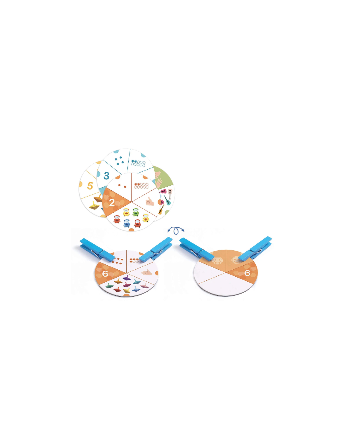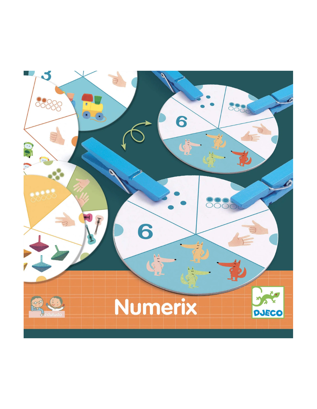 Un joc simple i lúdic sobre els números i les quantitats. La targeta de desafiament ofereix diferents representacions de quantitats: números, esquemes, constel·lacions, dits de la mà o dibuixos. Hauran de trobar entre les propostes les que corresponen a la casella acolorida. Una vegada hagin posat la pinça sobre la solució que creuen correcta, hauran de donar la volta a la targeta per a veure si és correcte. Eduludo Numerix de Djeco és un joc per a aprofundir el coneixement dels números i les quantitats.