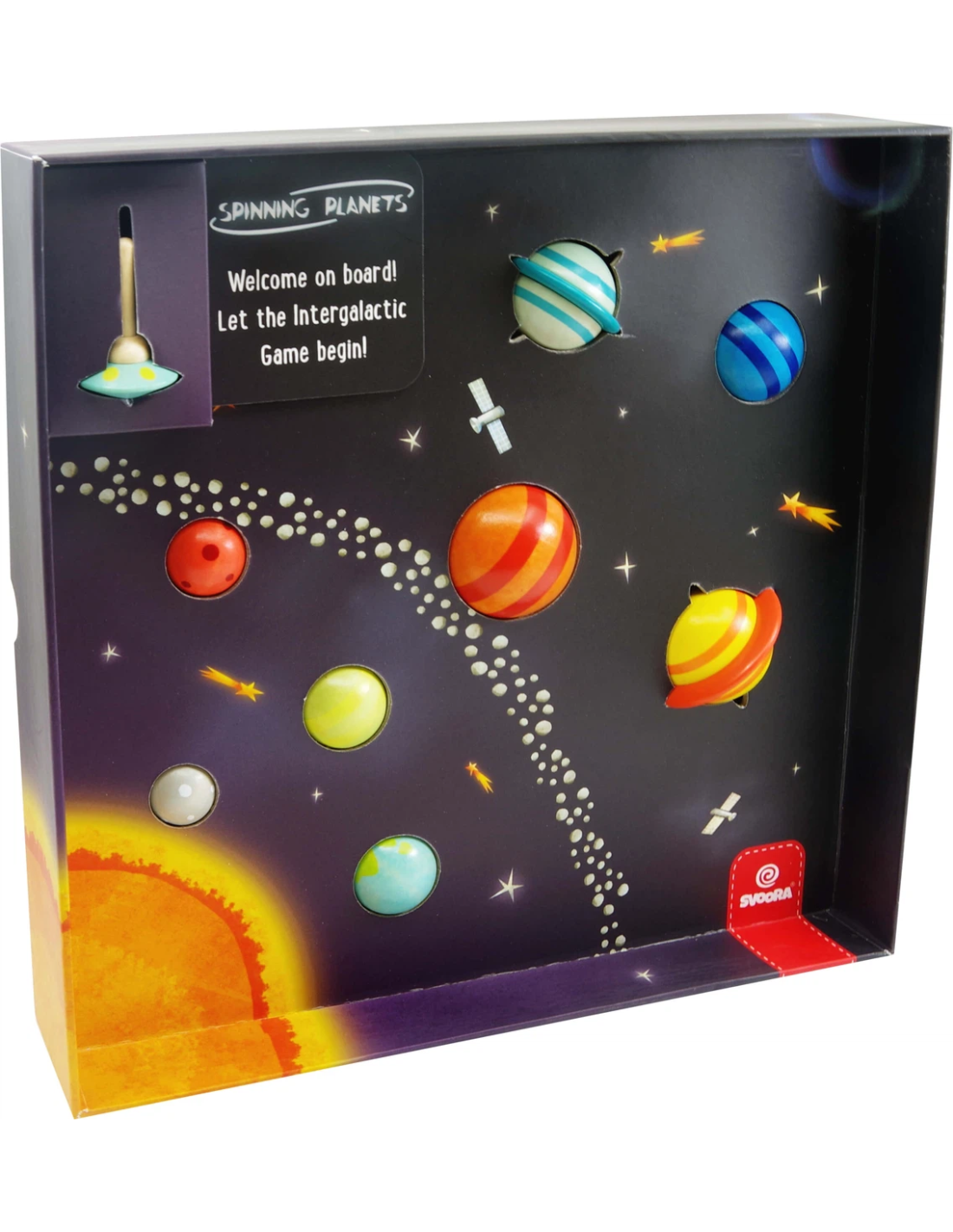 Aprèn els planetes de la nostra galàxia i fes-los girar! Un conjunt de 9 baldufes de fusta, 8 targetes d'informació i 24 targetes de missió. Només hauràs d'agafar una carta de missió, col·locar els planetes tal com diu la targeta i girar la part superior de la baldufa._x000D_