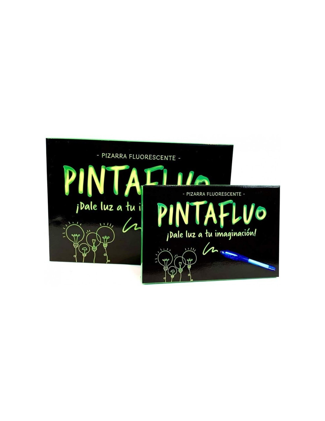 PintaFluo és una pissarra de mida A3 fotosensible que atrapa la llum i permet fer dibuixos a la foscor que duren alguns minuts dibuixats. El llapis inclòs té dues parts amb dues funcions, una per a dibuixar a la pissarra, i l'altra, un retolador de tinta invisible. Per a dibuixar amb llum, només s'ha de buscar un lloc fosc, encendre el bolígraf, i deixar brillar els teus dibuixos. El dibuix desapareixerà en uns 4-5 minuts. O bé es pot col·locar sobre la pissarra una de les 10 plantilles que venen incorporades i pintar els dibuixos. La tinta invisible permetrà escriure missatges sobre qualsevol superfície i només podrà ser vista il·luminant-la amb la llum del llapis._x000D_