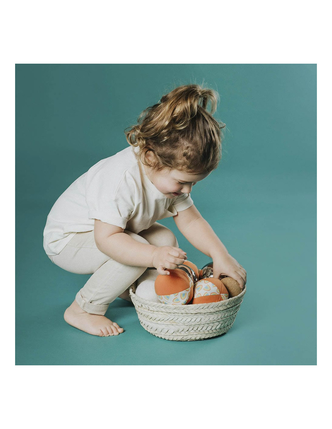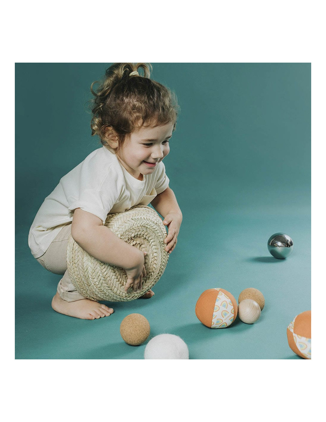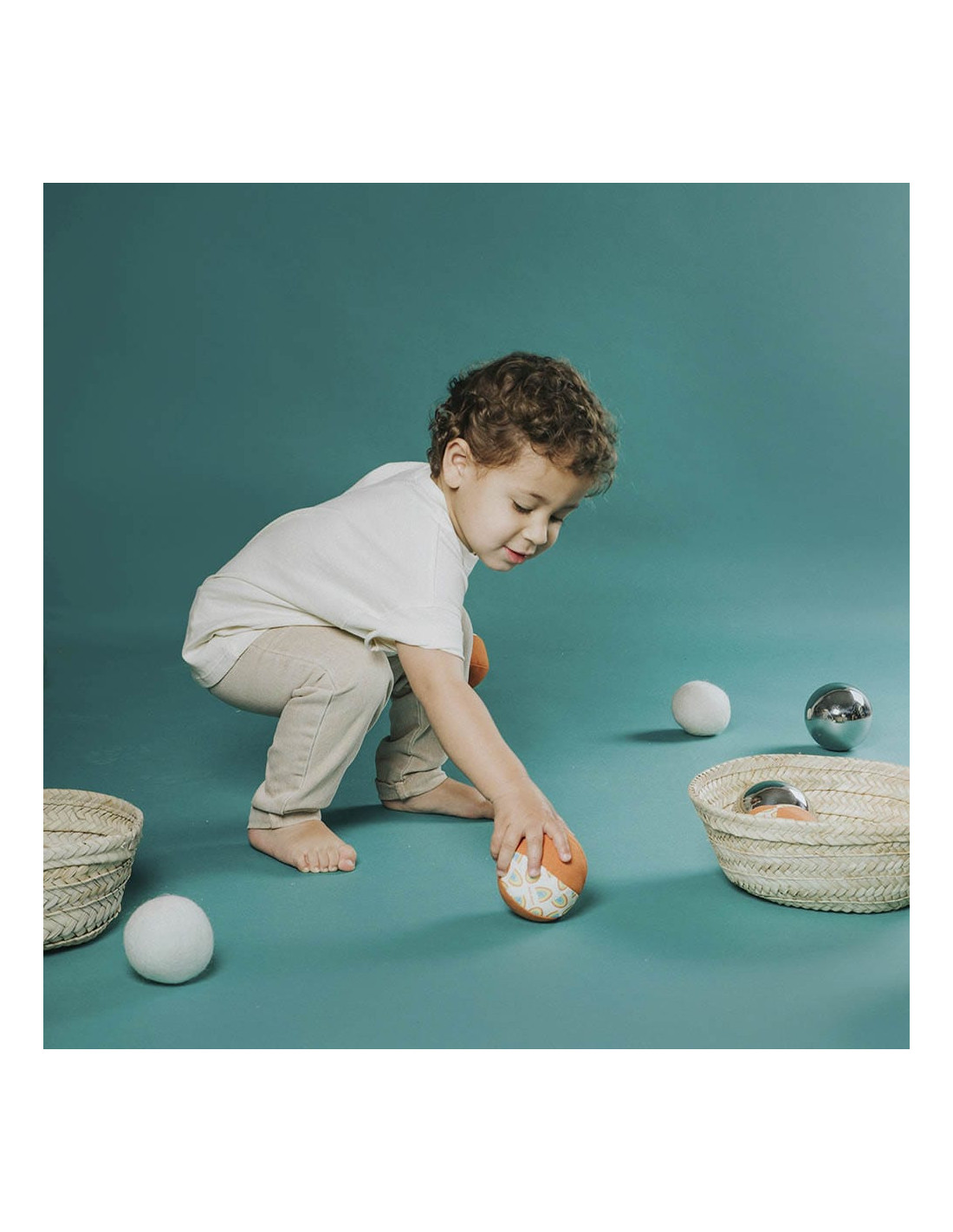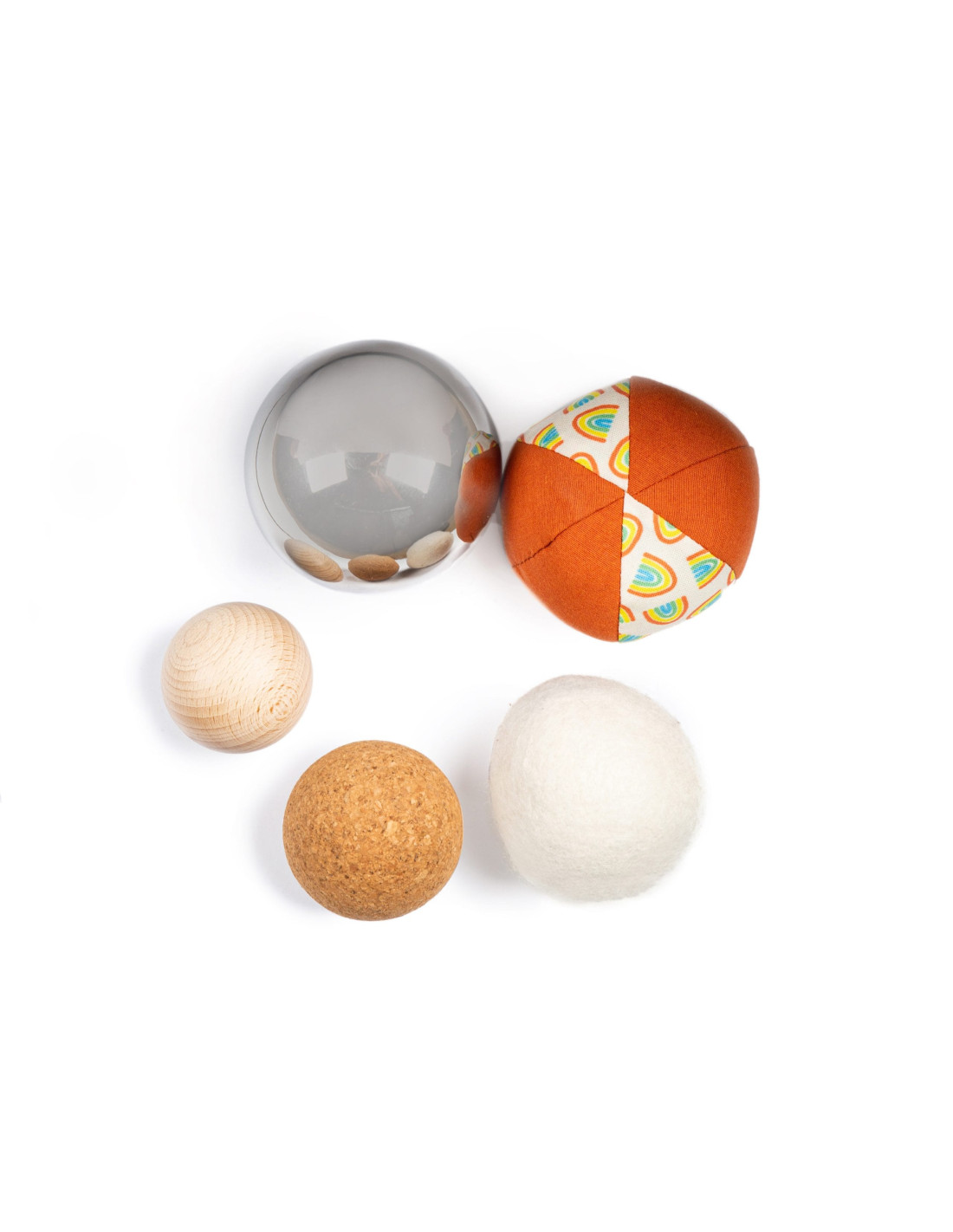 El joc de boles sensorials és una proposta pensada per acompanyar els nadons en les seves primeres exploracions a través del tacte i el moviment. Cada bola presenta una textura diferent i un color suau que convida a tocar, prémer, rodolar i descobrir noves sensacions.