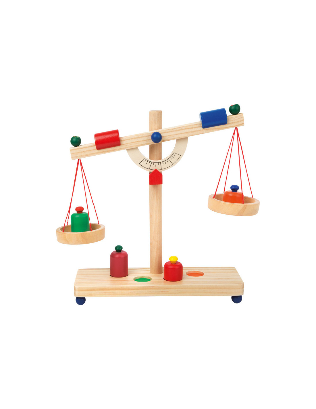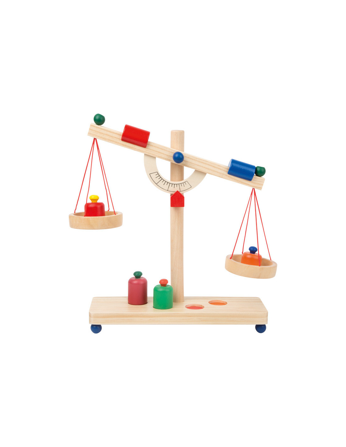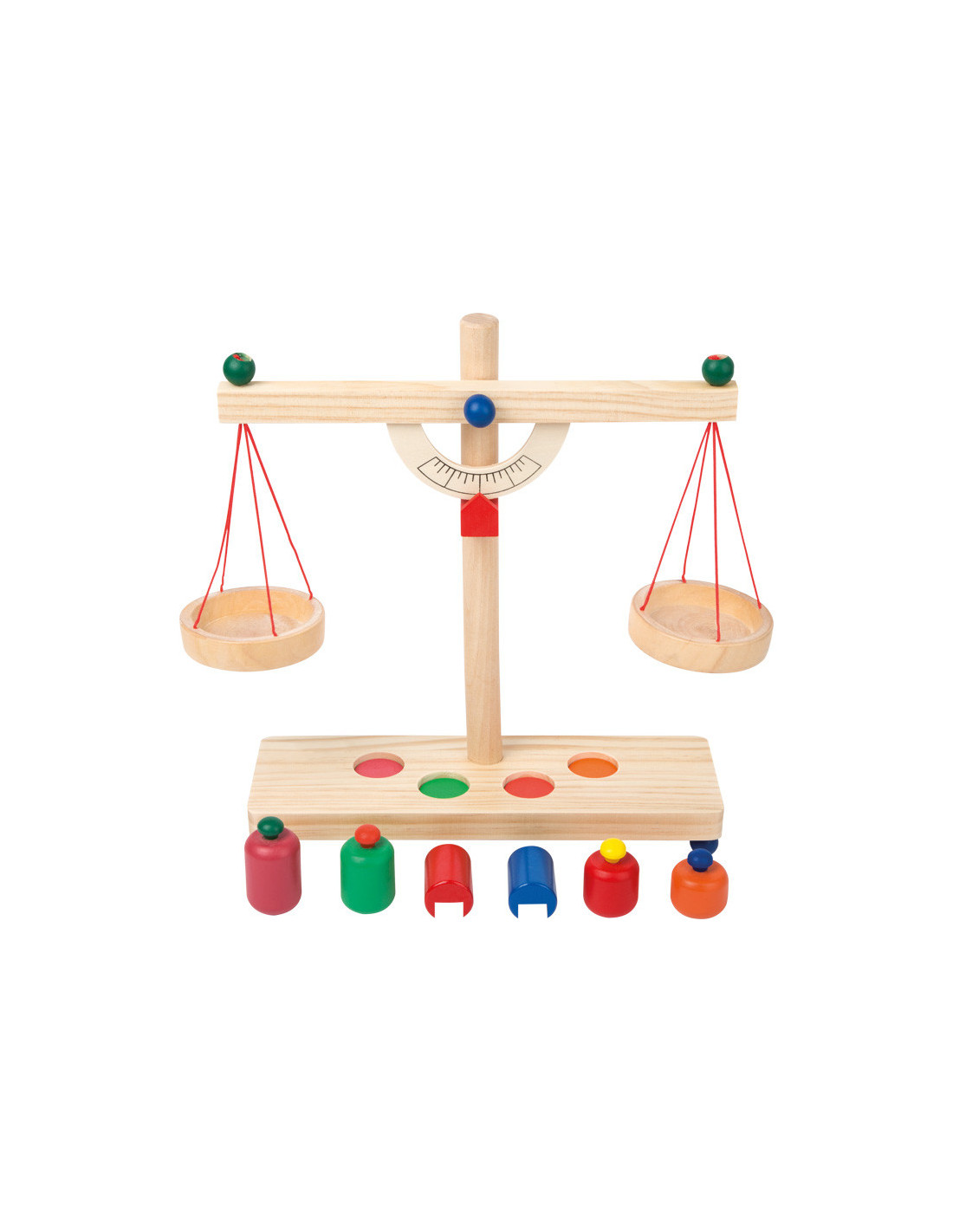 Amb aquesta clàssica balança, els petits aprendran sobre el pes i l'equilibri. Diversos productes com fruites i verdures poden ser fàcilment pesats amb aquesta balança de cuina d'alta qualitat. Fabricada en fusta massissa i 4 pesos pintats de color, és un element imprescindible per als més petits._x000D_