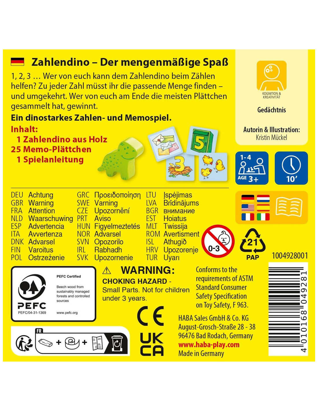 1, 2, 3... Qui de vosaltres pot ajudar a contar els dinosaures numèrics? Has de trobar la quantitat correcta per a cada número i al revés. Guanya qui hagi aconseguit més fitxes al final. Dino de los números d'HABA és un joc de memòria i números ple de dinosaures.