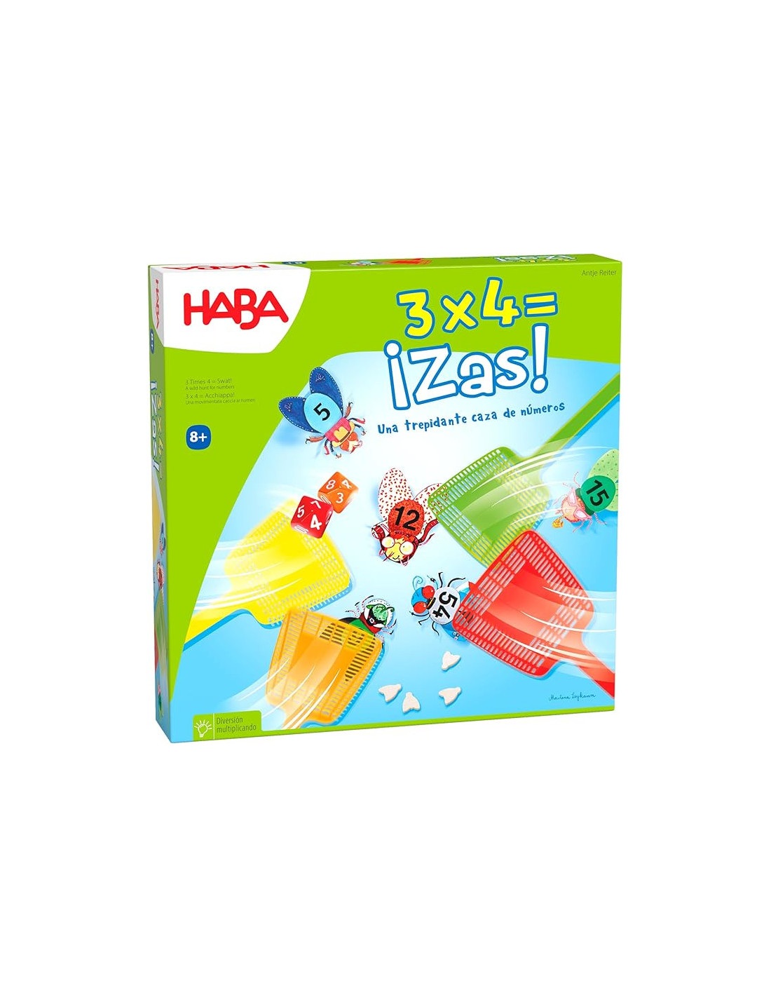 Quant és 5 per 8? 40, clar! Ara només heu de trobar la mosca correcta i colpejar sobre el resultat. 3×4= ¡Zas! d’ Haba és un joc de reacció per practicar les taules de multiplicar. Una vegada llançat el dau haureu de ser els més ràpids/es en trobar el resultat de la multiplicació i atrapar la mosca amb el resultat correcte.