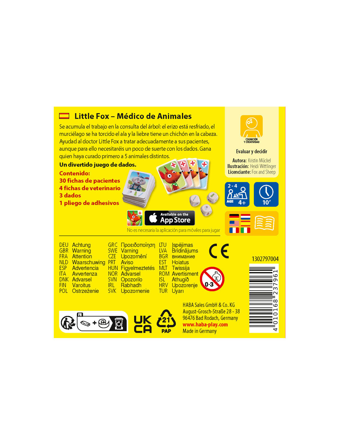 S'acumula la feina a la consulta de l'arbre: l'eriçó està refredat, el ratpenat s'ha torçat l'ala i la llebre té un bony al cap. Ajudeu al doctor Little Fox a curar adequadament als seus pacients, tot i que per fer-ho necessitareu una mica de sort amb els daus. Al joc de taula little fox, Médico de animales d'HABA guanya qui hagi curat primer a 5 animals diferents.