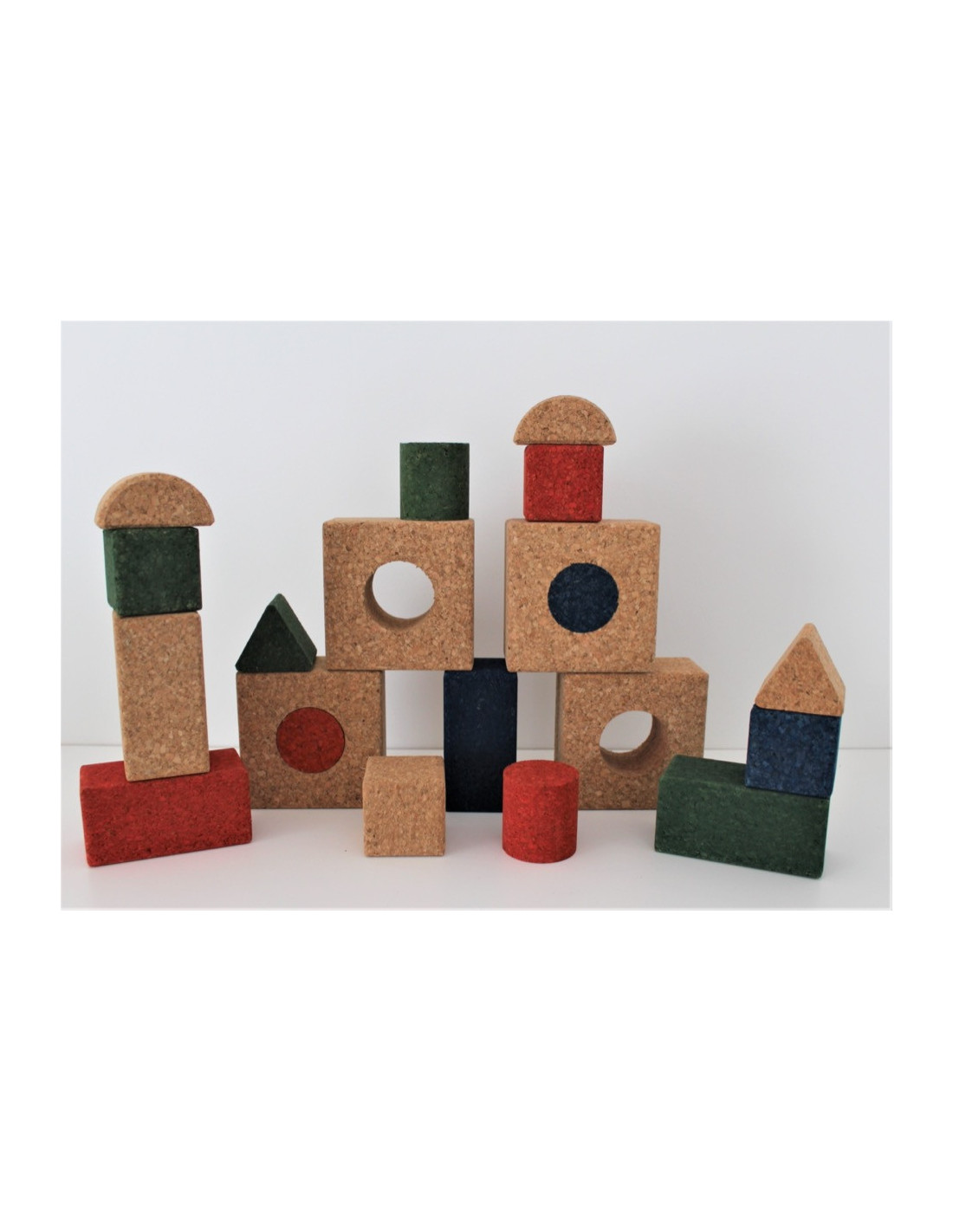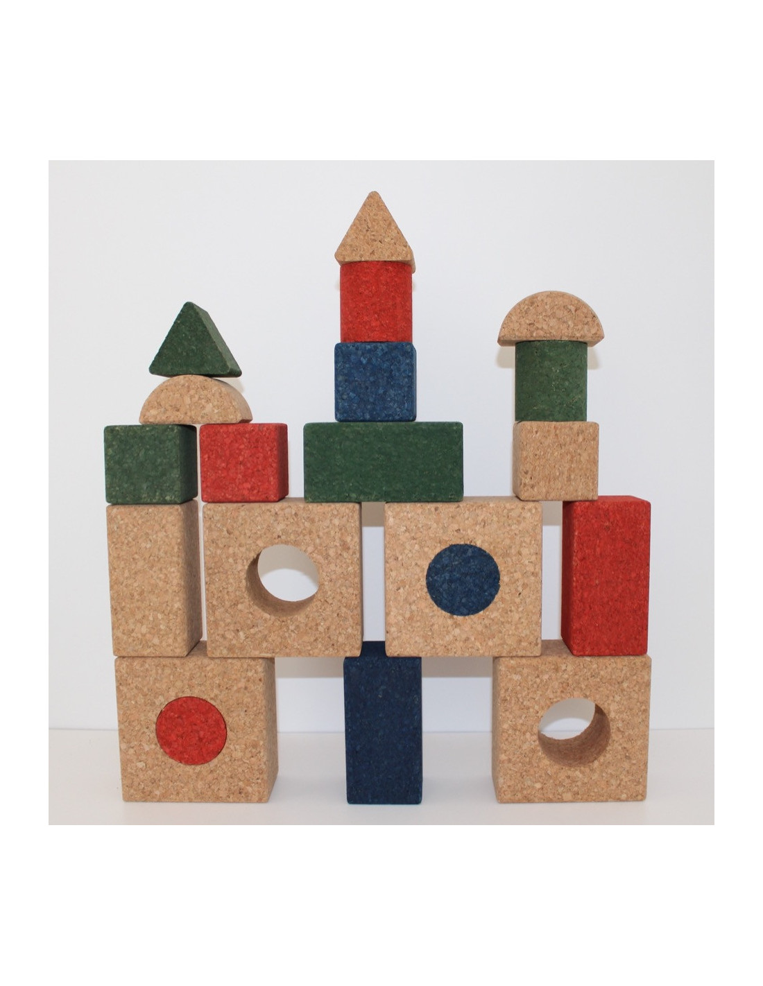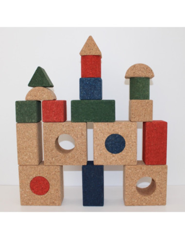 Joc de construcció fet amb suro. Conté 20 peces geomètriques de diferents colors. Aquest tipus de jocs fomenten la imaginació, la creativitat i la motricitat fina dels infants._x000D_