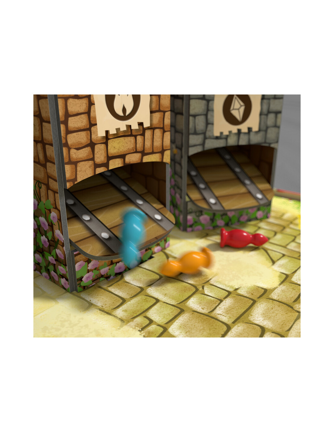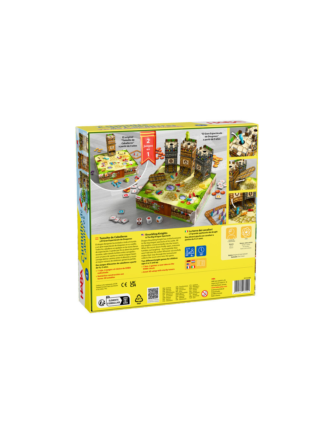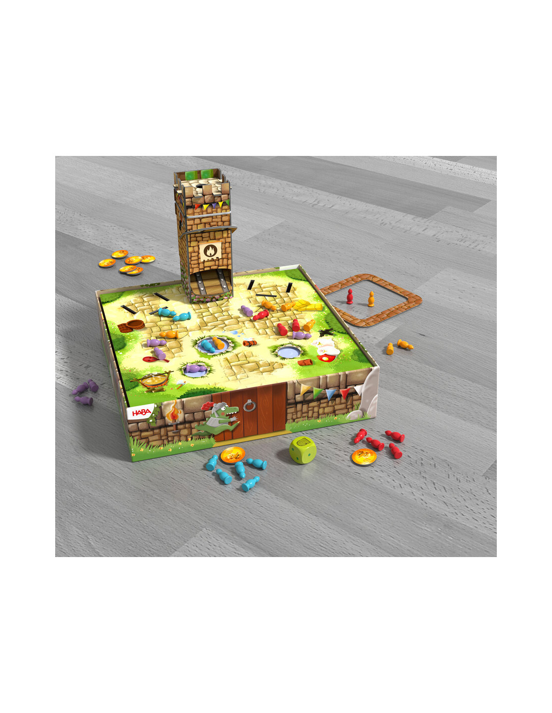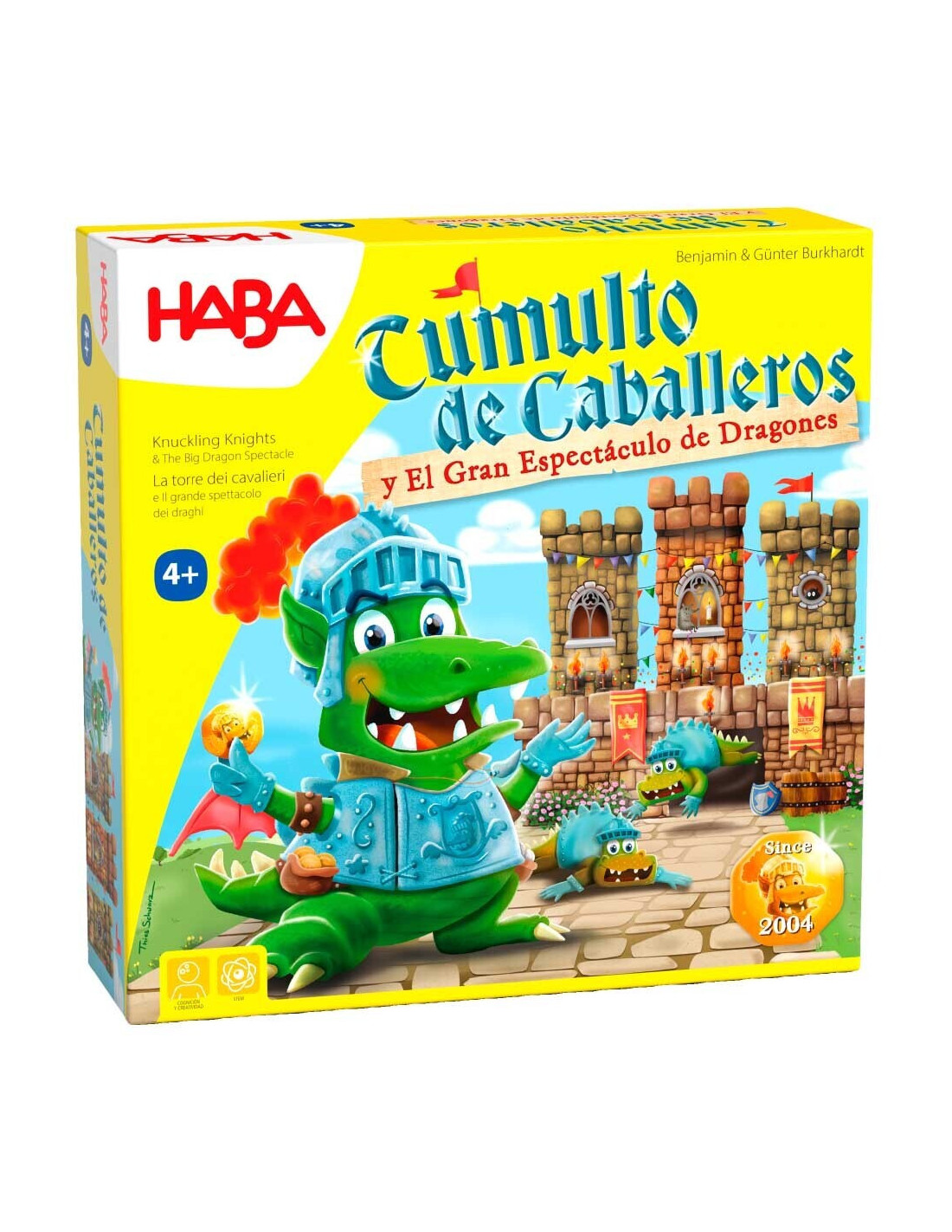 Un clàssic reinventat que torna al catàleg d'HABA. El gran espectacle dels dracs ha tornat! Els cavallers es preparen i per torns van entrant a la torre fins que obri la comporta i comenci el tumult. Qui aconsegueixi més cavallers guanya la partida. A la segona variant del joc, es juga amb 3 torres i aquí haurem de ser els més astuts/es a aconseguir endevinar en quina torre s'amaguen més cavallers per aconseguir acumular-ne més.