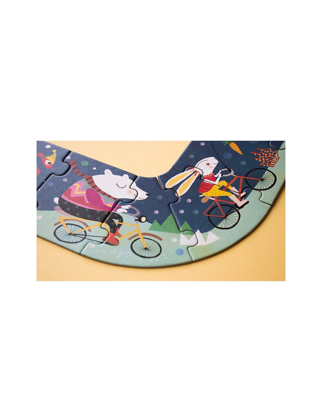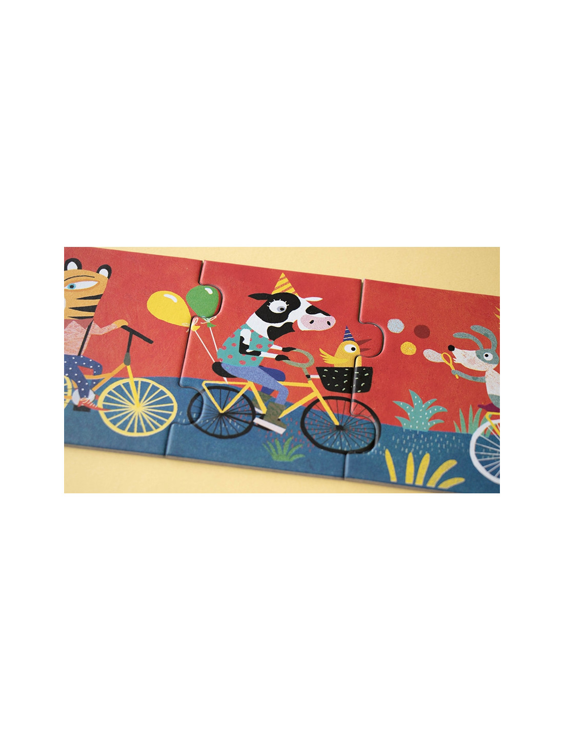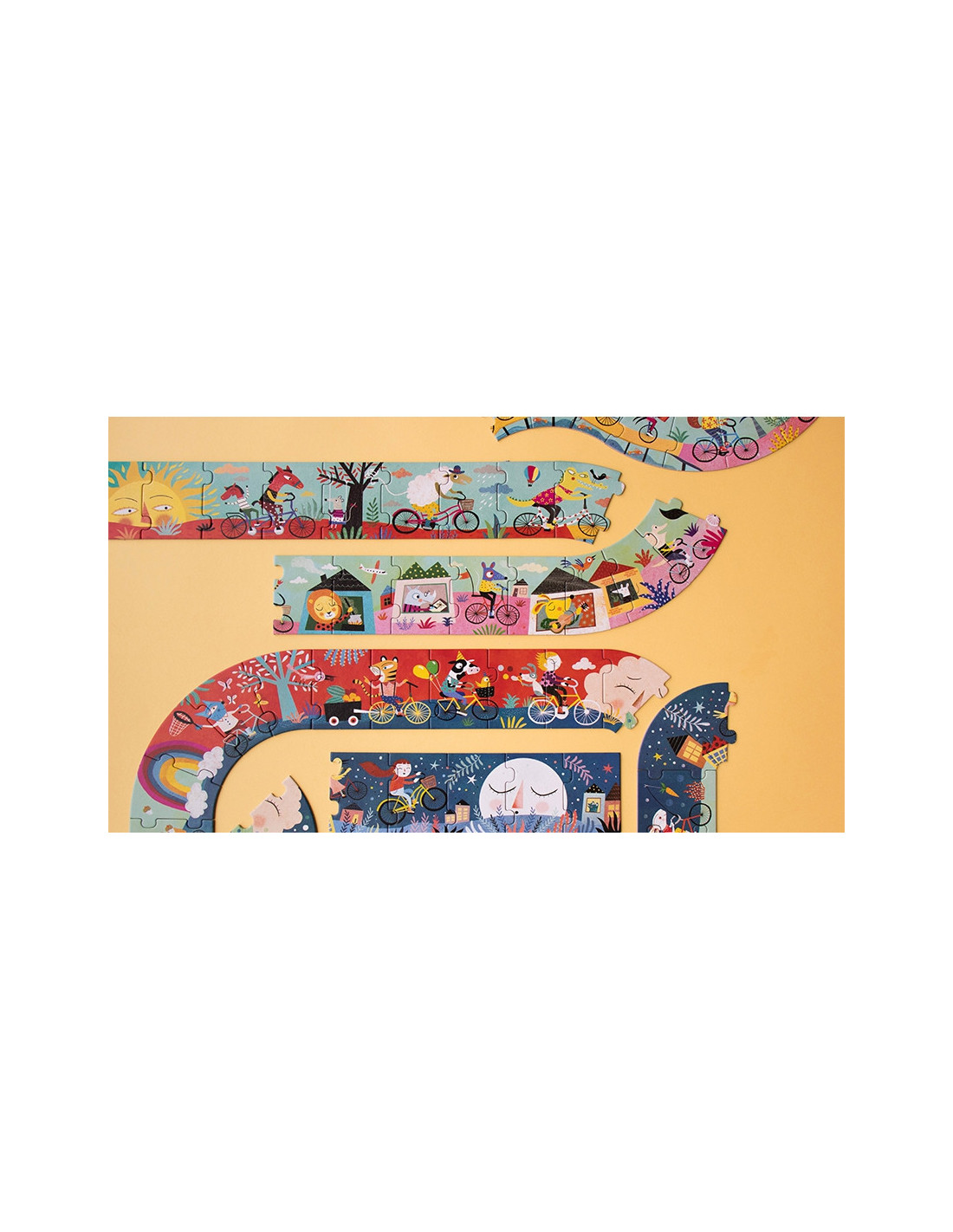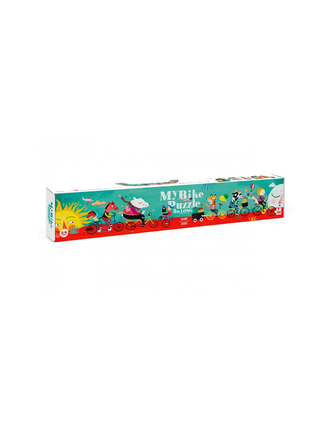 Amb aquest puzzle My Bike de Londji de 54 peces i tres metres de llarg la diversió està assegurada. Conforme es va muntant es va descobrint el que succeeix en aquesta fantàstica excursió amb bicicleta.