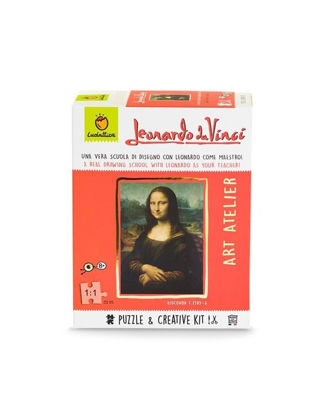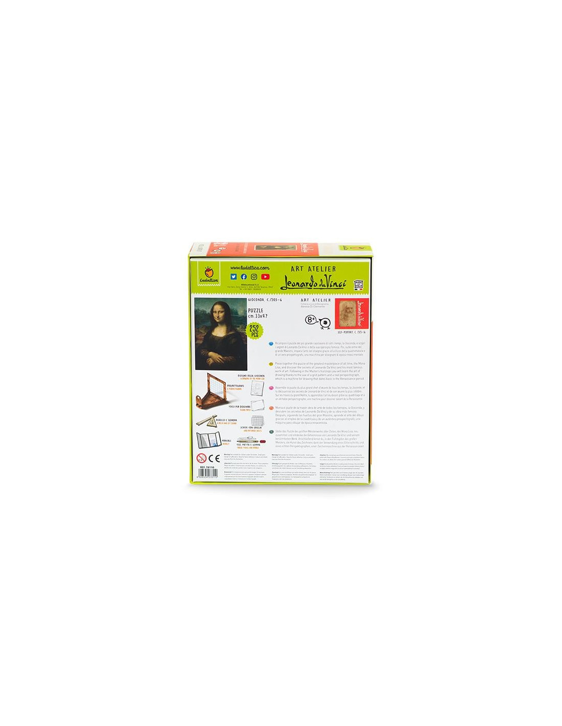 Munta el puzle de la millor obra d'art de tots els temps, La Gioconda, i descobreix els secrets de Leonardo da Vinci i de la seva obra més famosa amb l'Art Atelier Leonardo Da Vinci de Ludattica. Després, seguint els passos del gran mestre, aprèn l'art del dibuix gràcies a l'ús de la quadrícula i d'un autèntic perspectògraf, un aparell per a dibuixar d'època renaixentista.