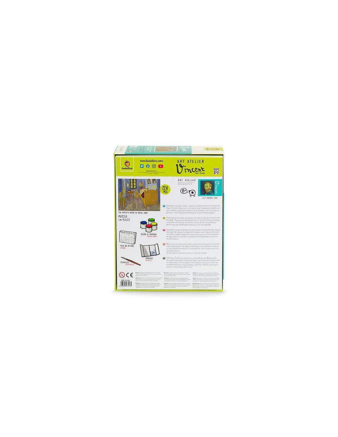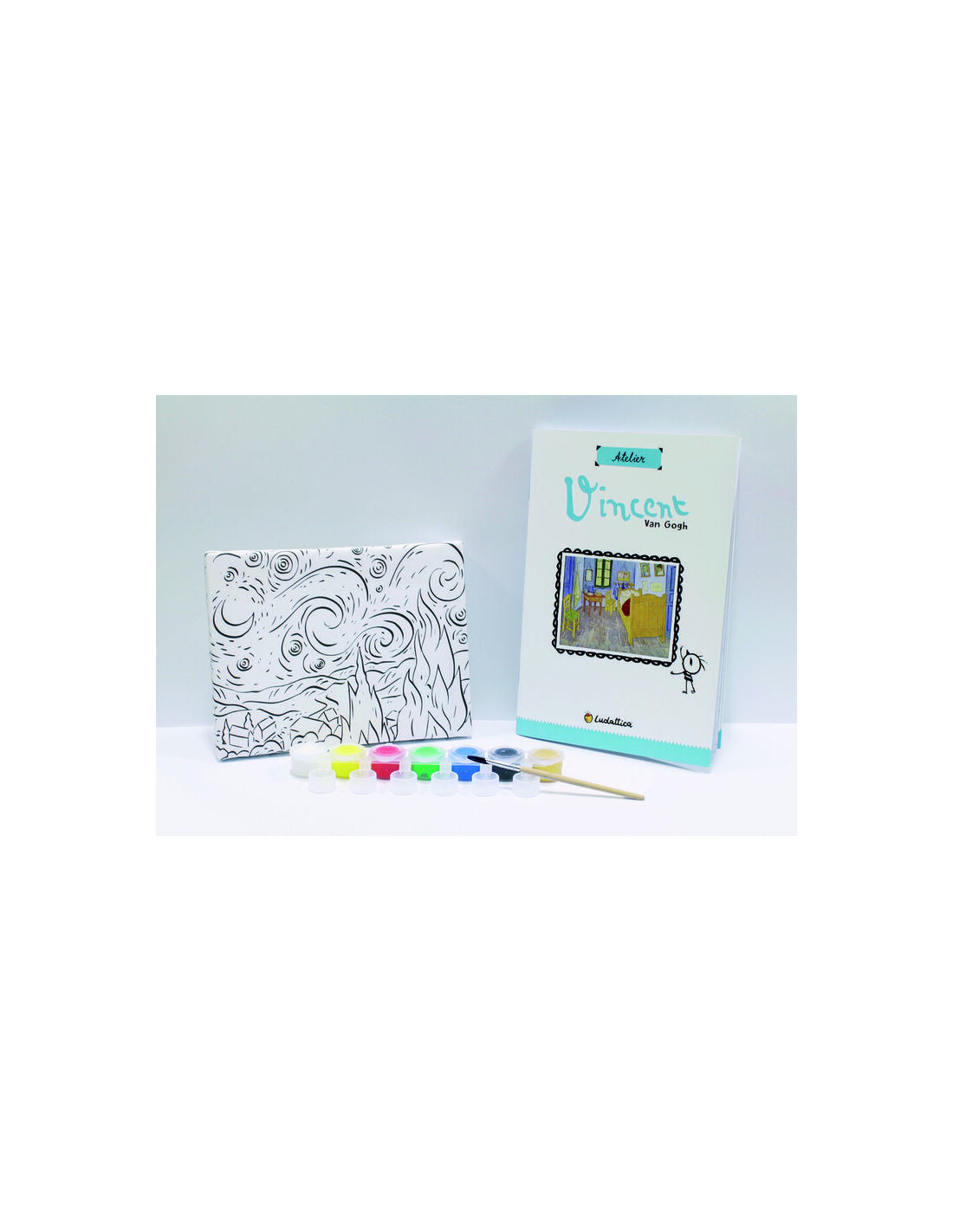 El puzle i el kit creatiu per a convertir-se en un autèntic pintor! Amb l'Art Atelier Van Gogh de Ludattica, els nens i nenes descobreixen l'obra del gran artista muntant el puzle de la seva obra mestra: “L'habitació de Vincent”. Després, posen a prova la seva creativitat amb el laboratori de pintura, un set complet format per: 7 colors de tempera d'alta qualitat, un pinzell i un autèntic llenç de pintor muntat sobre el seu bastidor de fusta. El kit permet crear així un quadre inspirat en una altra famosa obra de l'artista, la Nit estrellada, per a penjar a l'habitació.